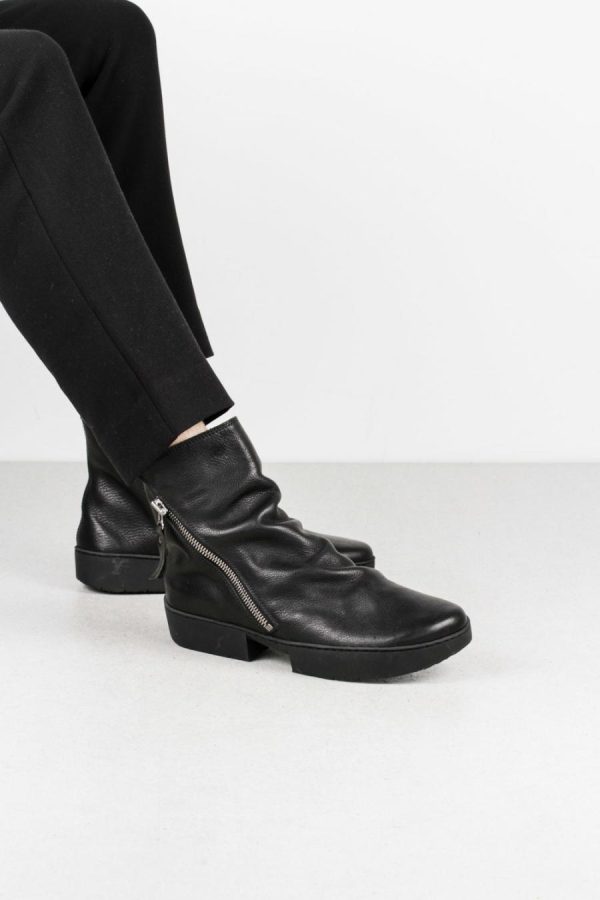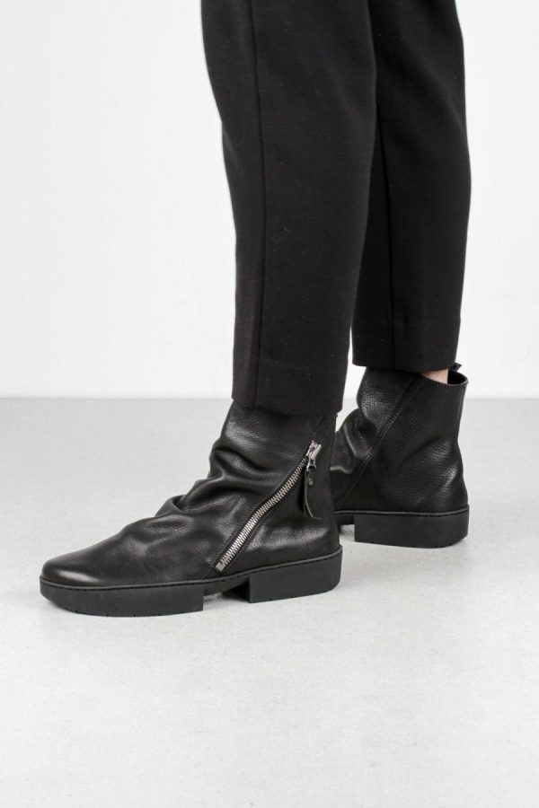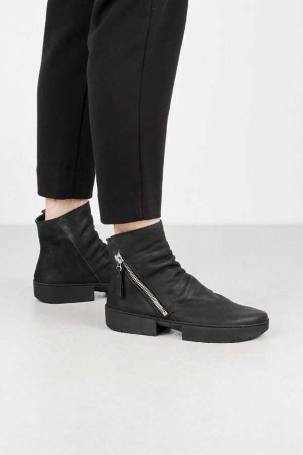 Men’s variant of this flat unisex ankle boot with diagonal, wide metal zip on the outside and light folds on the instep.