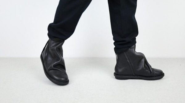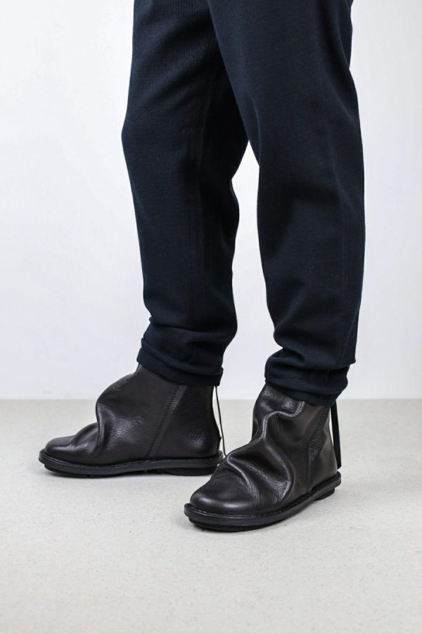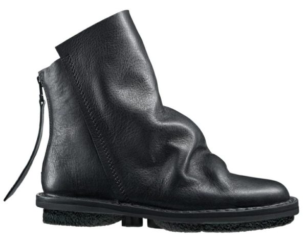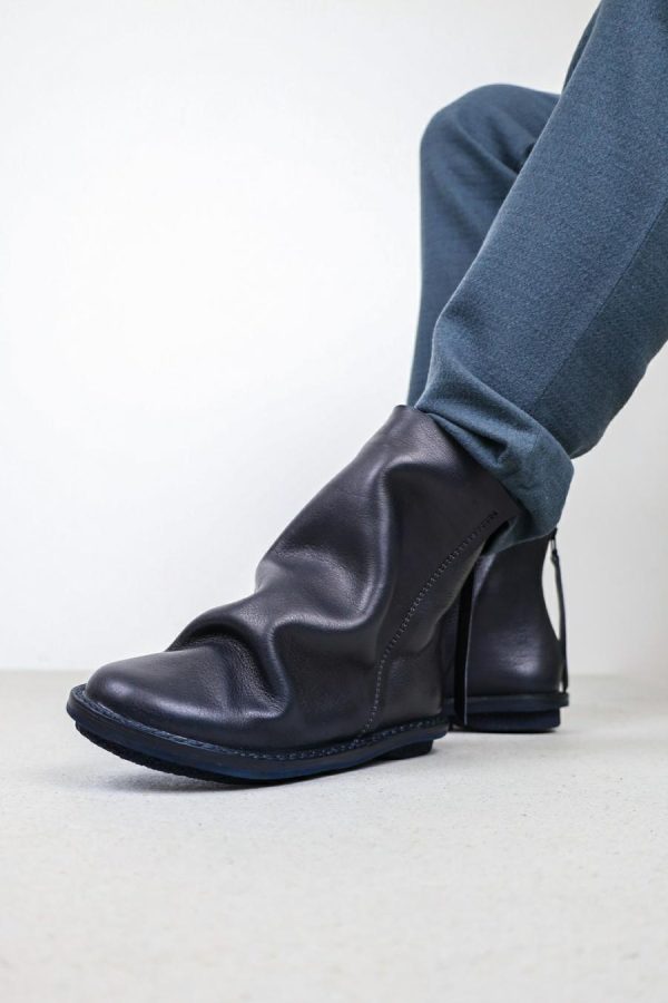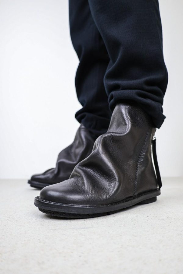 Voluminous layering with raw edges and thick seams gives this ankle-high boot with a zipper at the heel a dramatic silhouette.