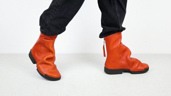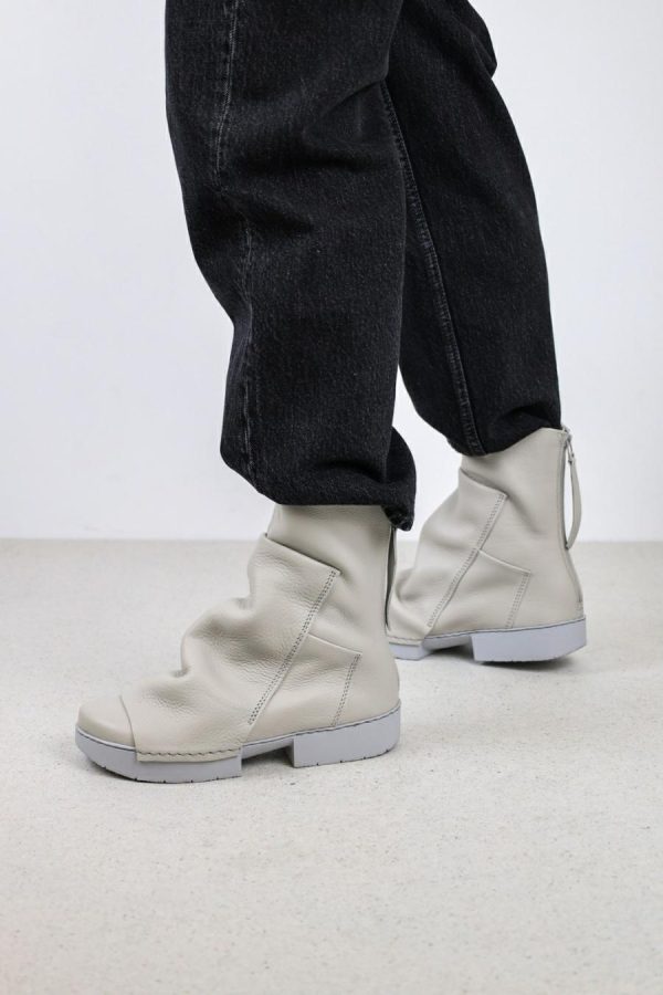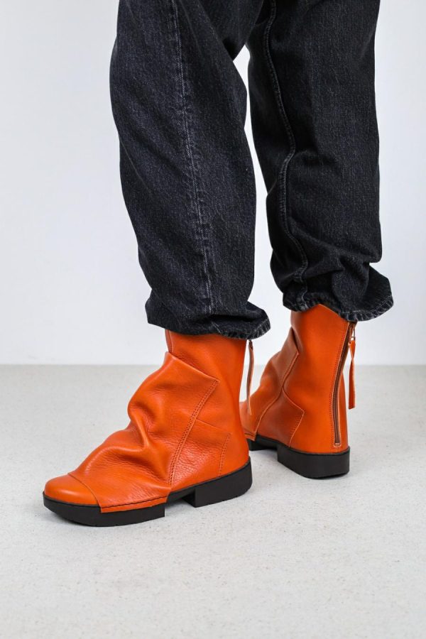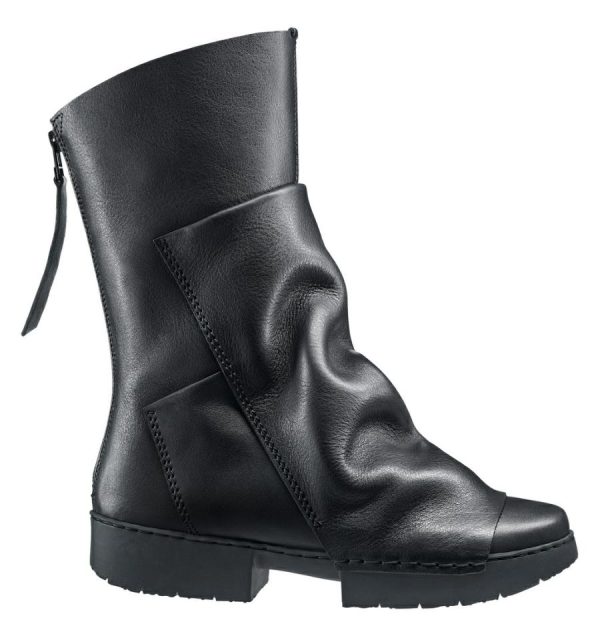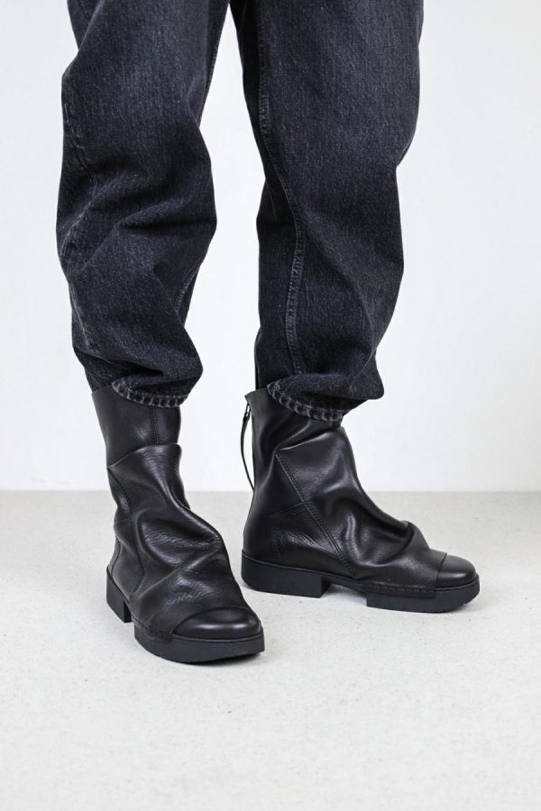 A voluminous extra layer of leather over the instep gives this calf-high boot its unique silhouette. The boot is finished with a zipper at the back seam.