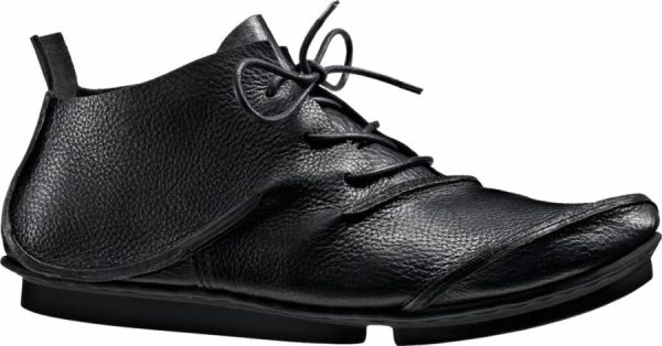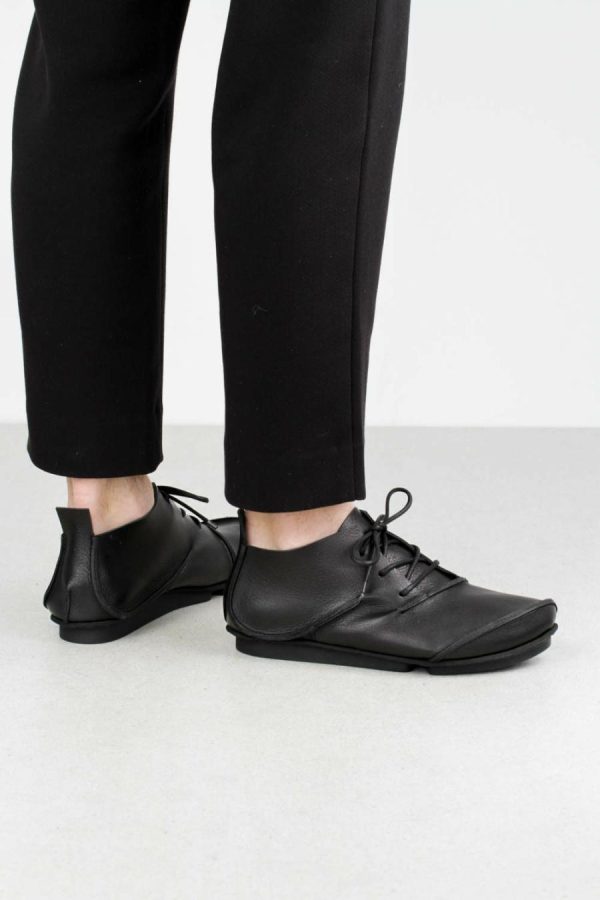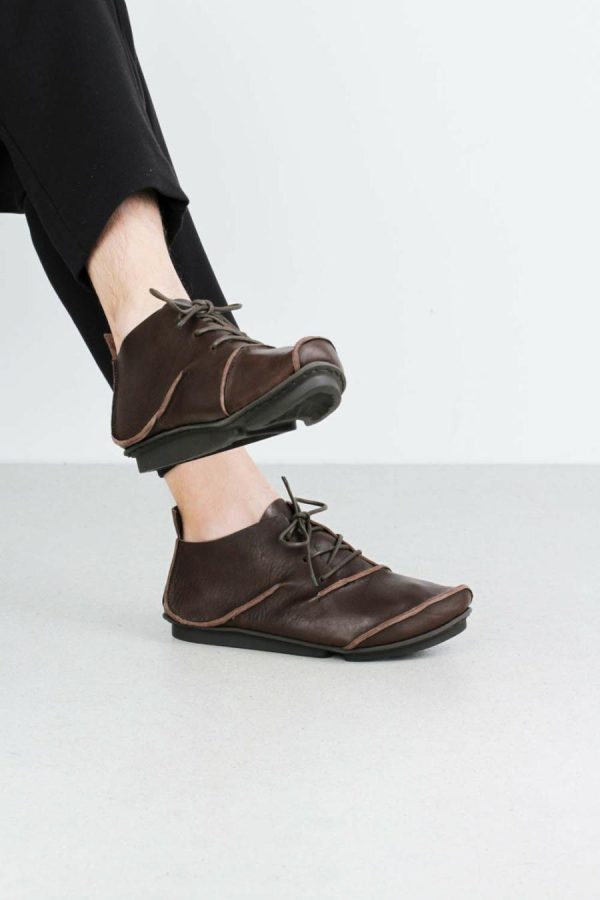 Men’s version of this elegant, asymmetrical lace-up with two elliptical raw seams and semicircular toe shape.