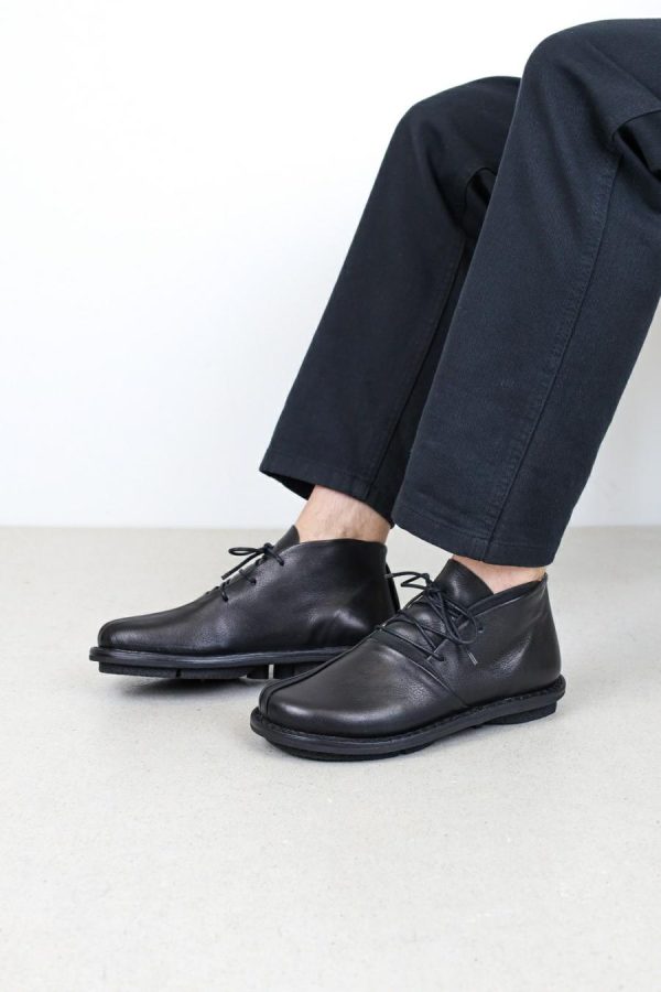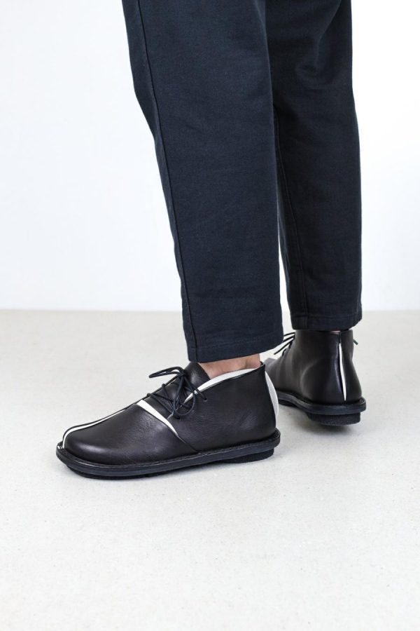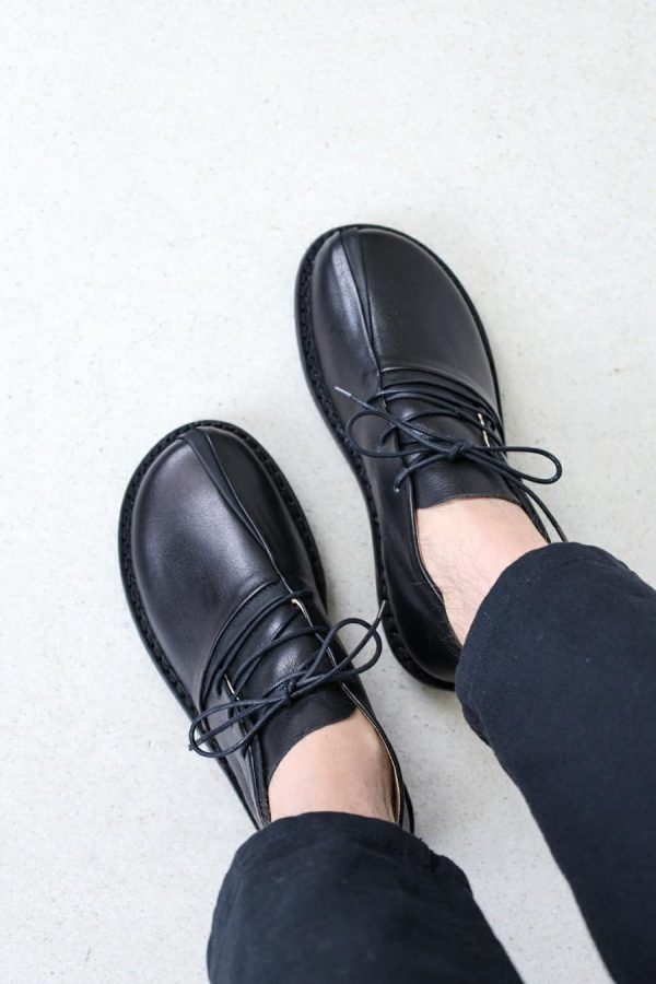 Finely sewn, organically curved sections overlaying classic intersecting lines define this asymmetrical men’s lace-up’s elegant aesthetic.