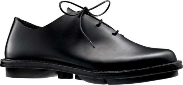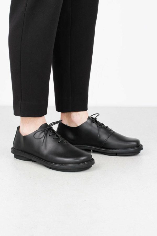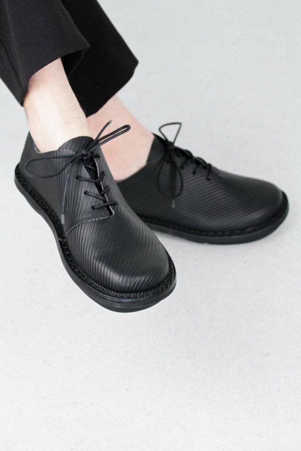 Simple men’s lace-up shoe on the closed sole in simple black or with stripes embossed leather.