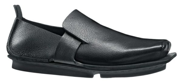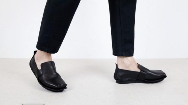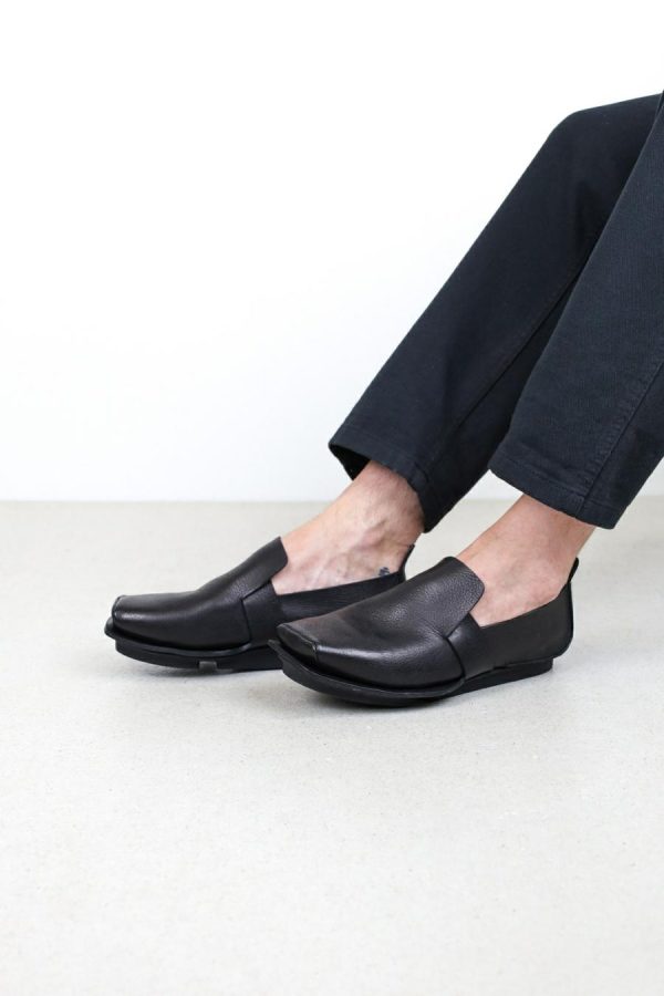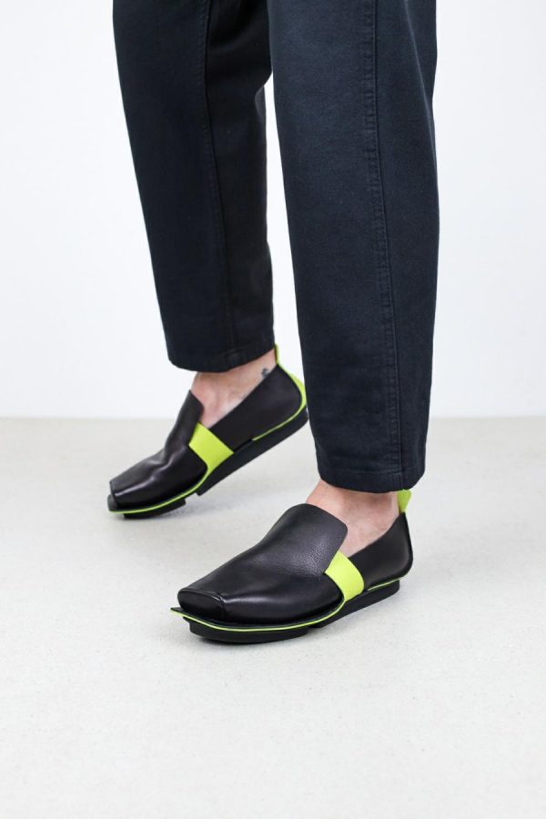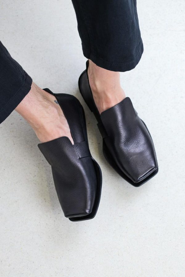 Between the simple square-toe loafer and the flat Penna sole, a striking circumferential midsole is incorporated, which leads in an elegant line to an elasticated strap concealed under the tongue.