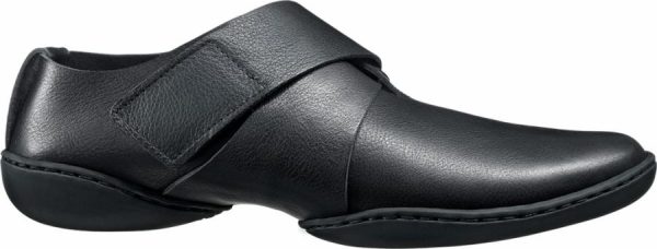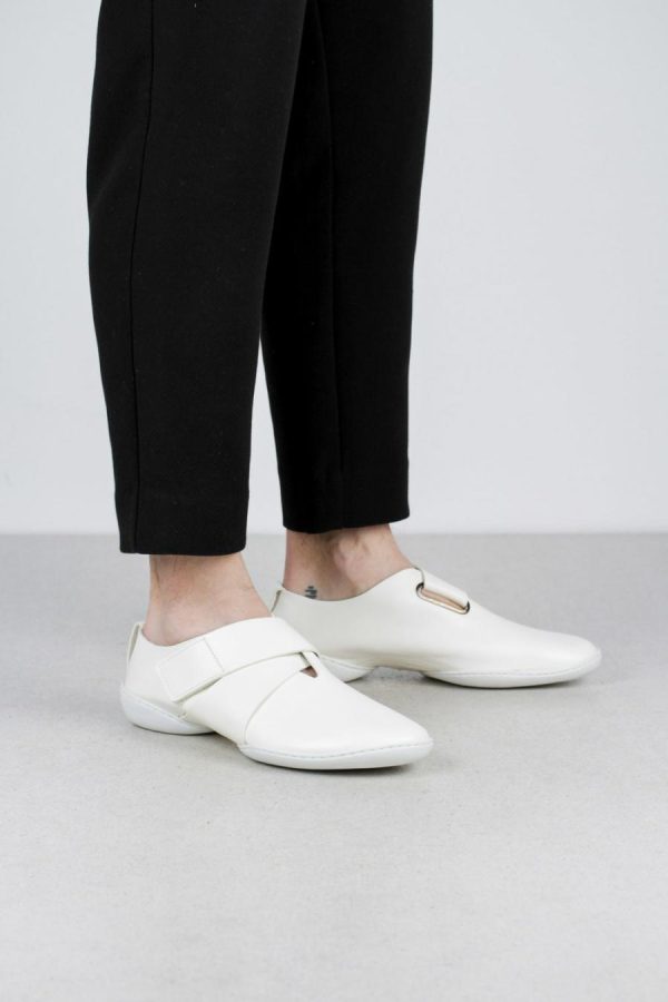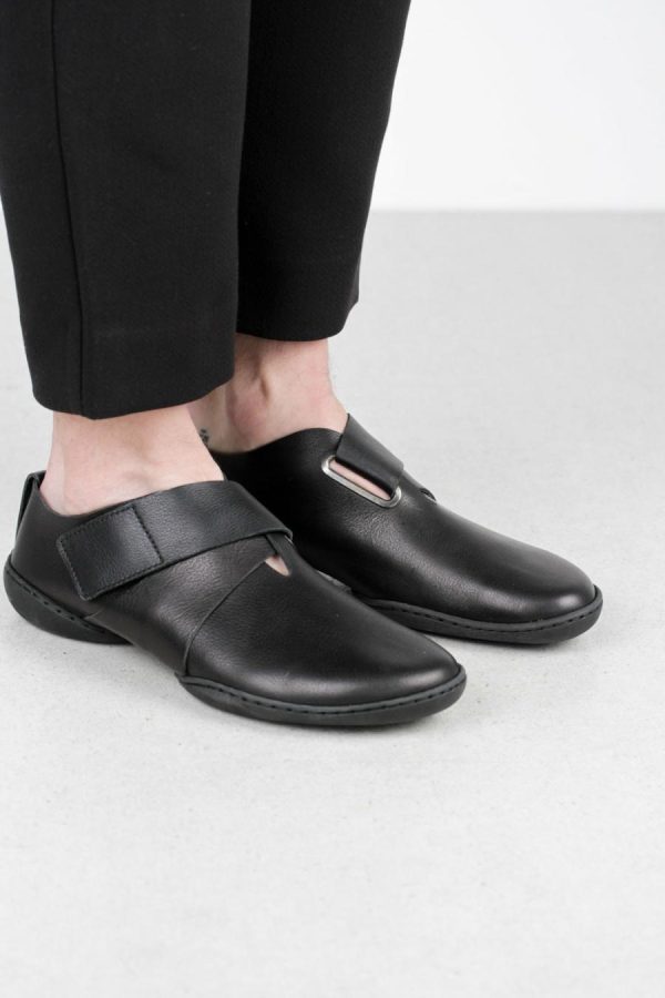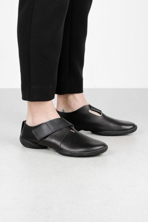 Sporty shoe with velcro fastening, decorative metal loop and dynamic lines.