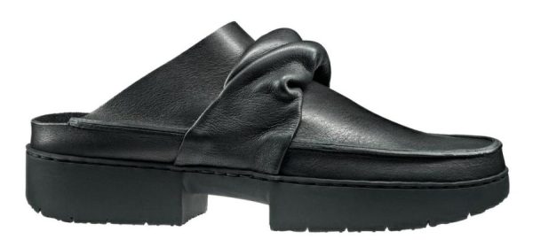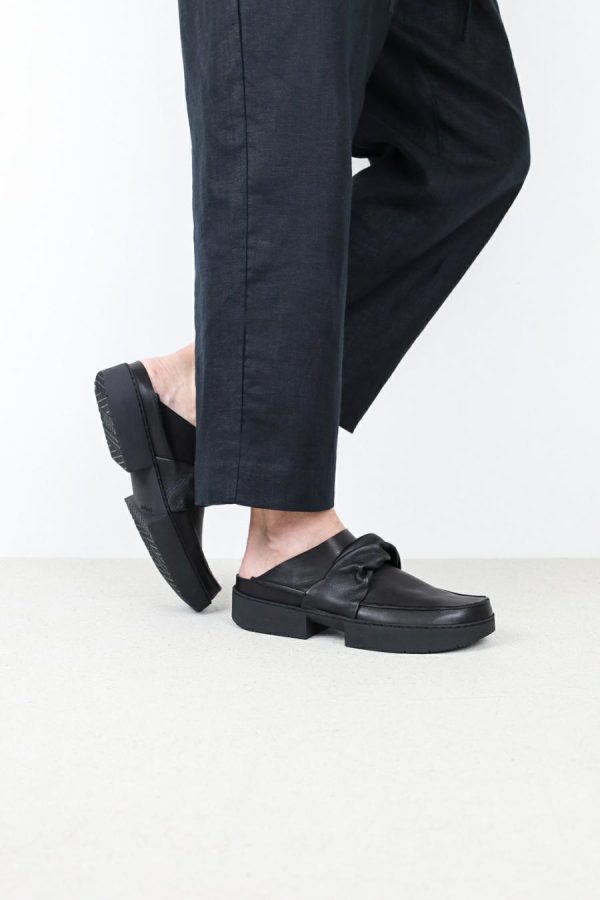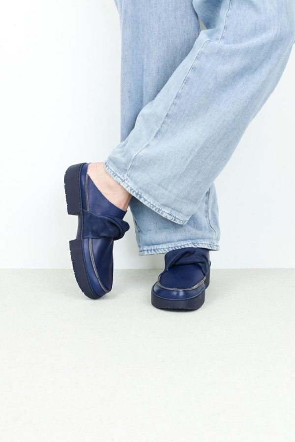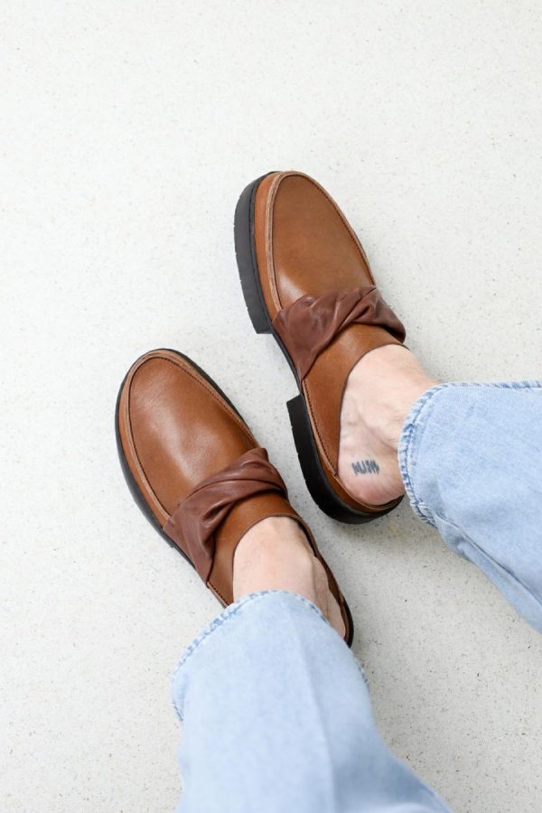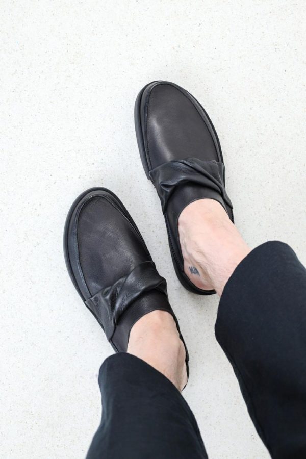 Unisex slip-on shoe with soft leather element twisted over the instep.
