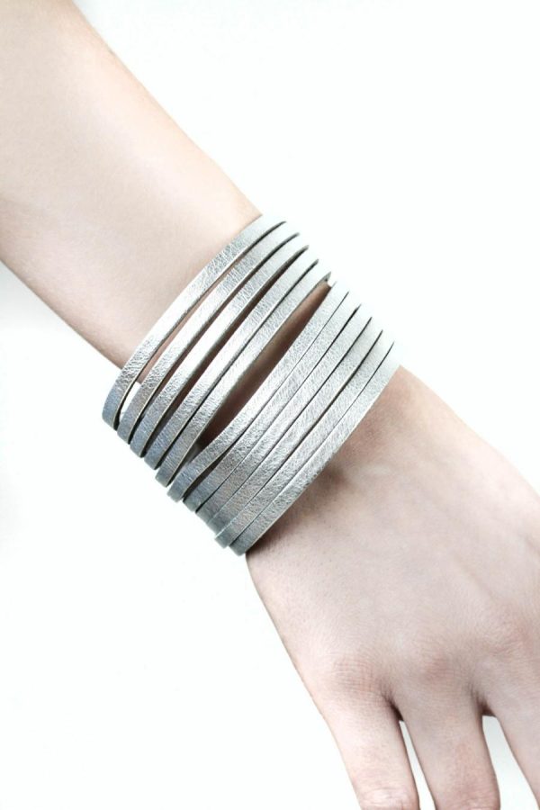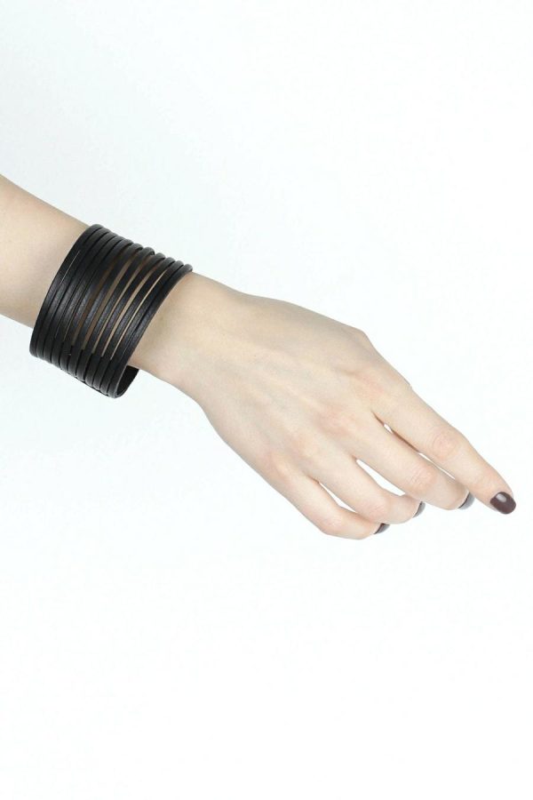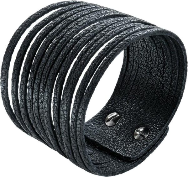 Elegant bracelet made of leather, multiple slits with two push buttons as closure.