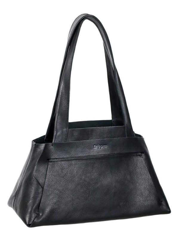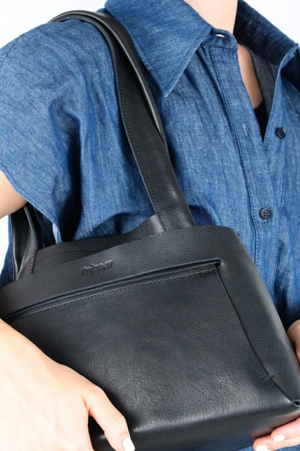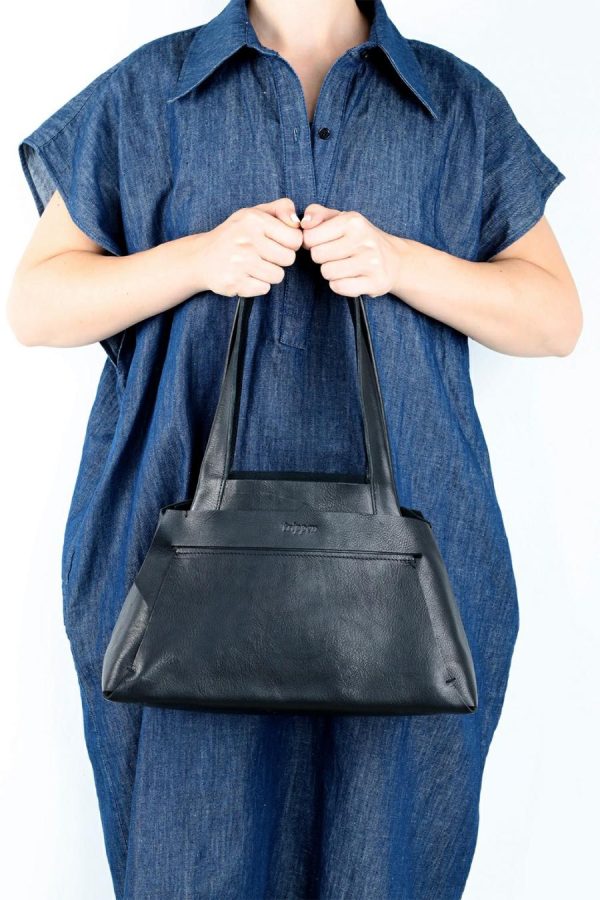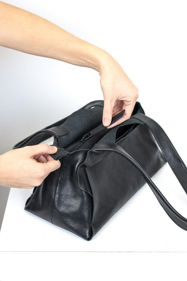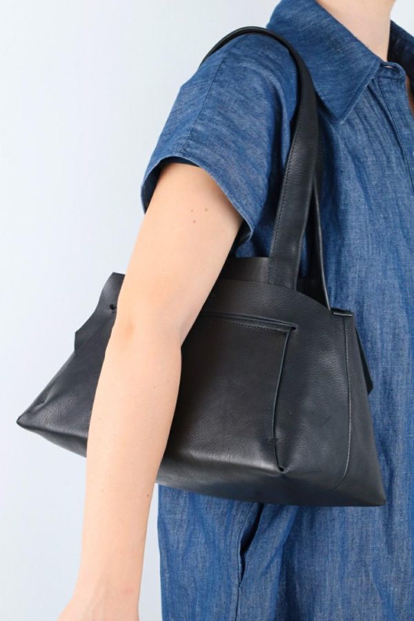 The geometric volume of this refined baguette bag is achieved using the Origami technique by folding a single piece of leather onto itself. Just a couple of seams ensure its usability and secure the handles.