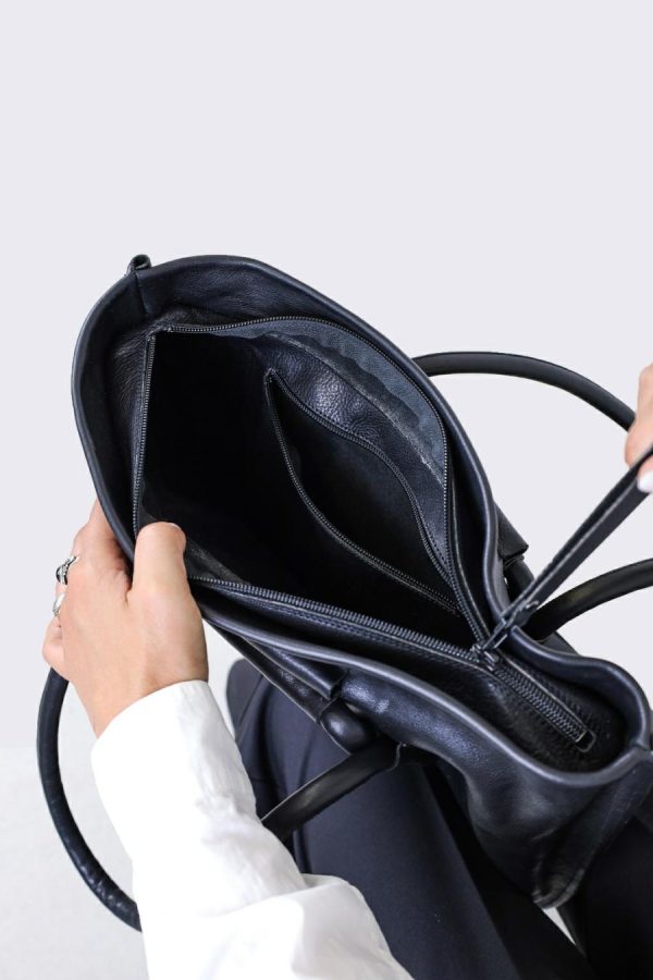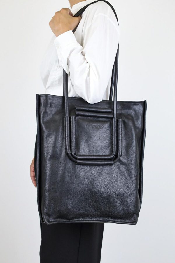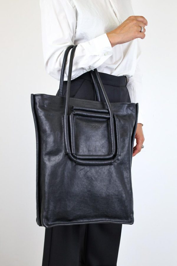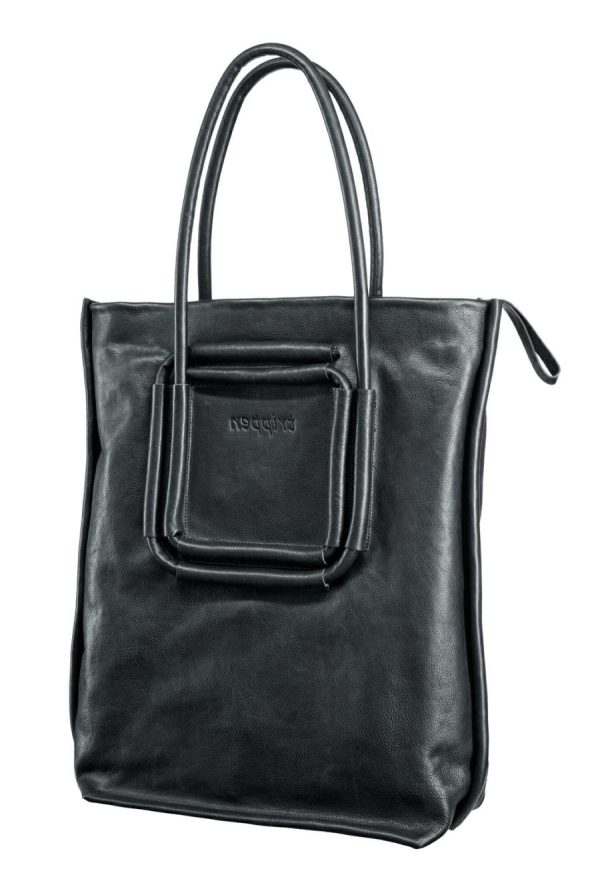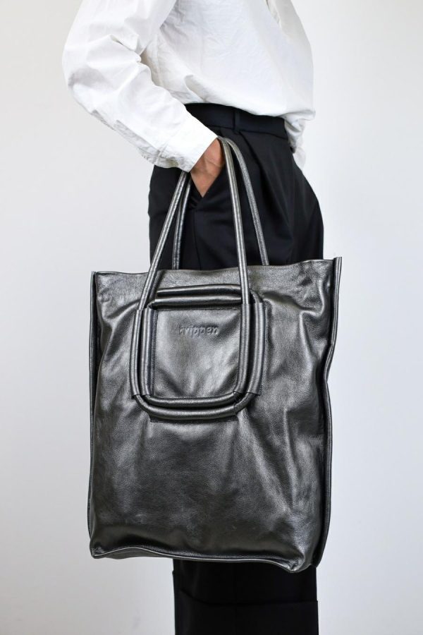 Double leather loops are sewn onto our simple tote bag in a square, the function of which is to adjust the length using various strap guides, which also form the graphic design.