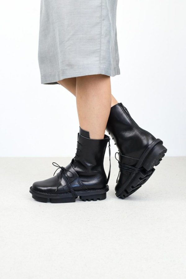 This ankle boot was created in collaboration with the Stuttgart label PalOffner. The lacing runs from top to bottom and wraps around overlapping leather parts around the instep and sole. The boot closes with a zipper at the back.