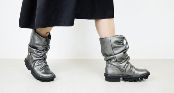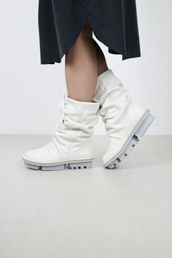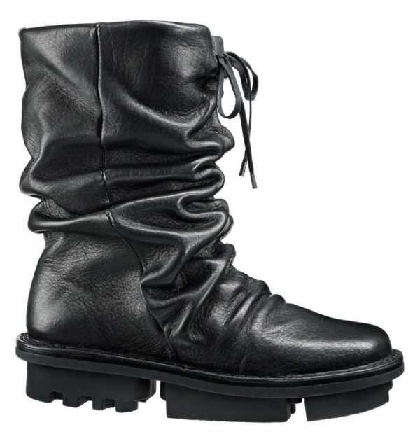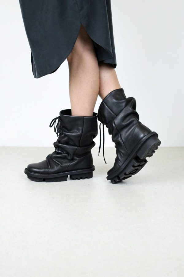 The generous gathering of the soft leather upper makes this boot seem extra voluminous. The drawstring lace at the front permits easy adjustment of the height. The boot is also available with fur lining.