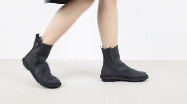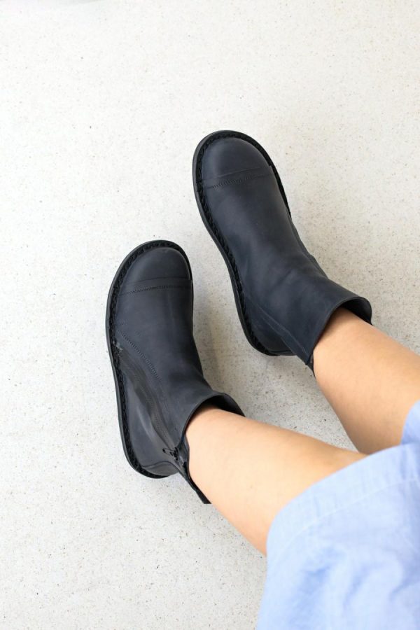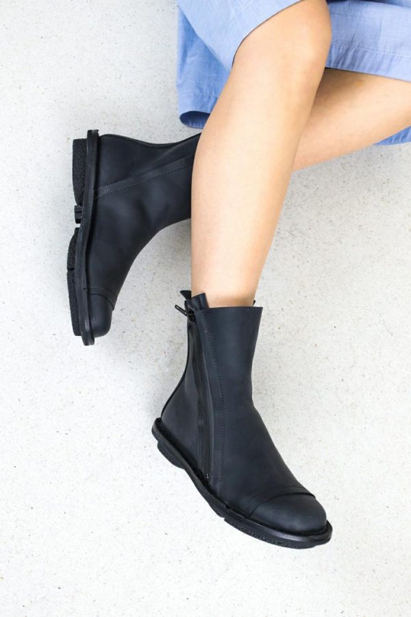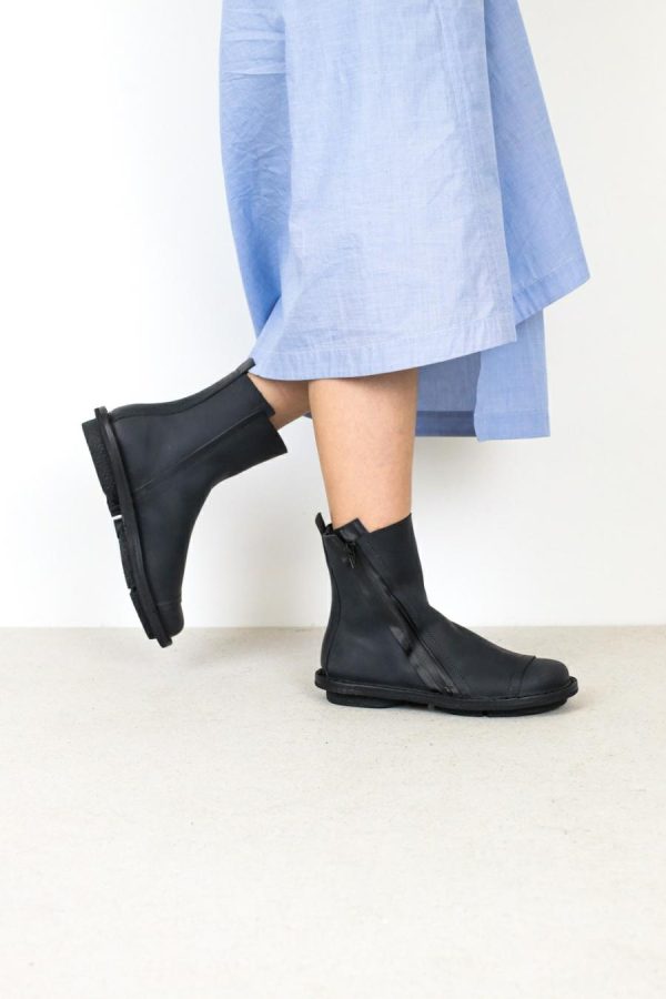 Simple Unisex ankle boot with a rubberised zip running diagonally across the exterior.