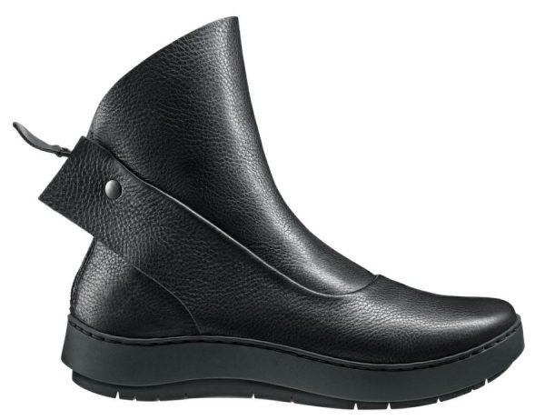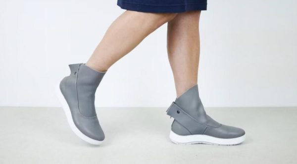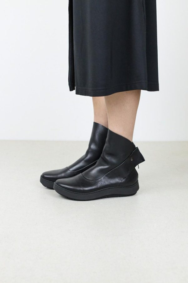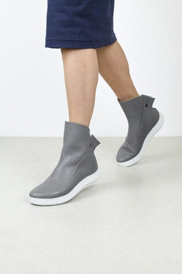 The vamp’s classic intersecting line continues beyond the heel with a wide strap, and is fastened with a rivet in front of the zip at the heel.