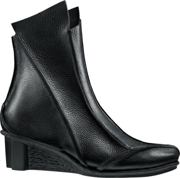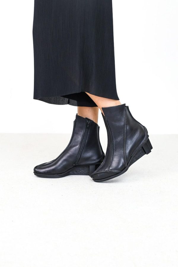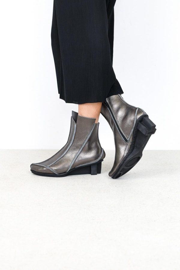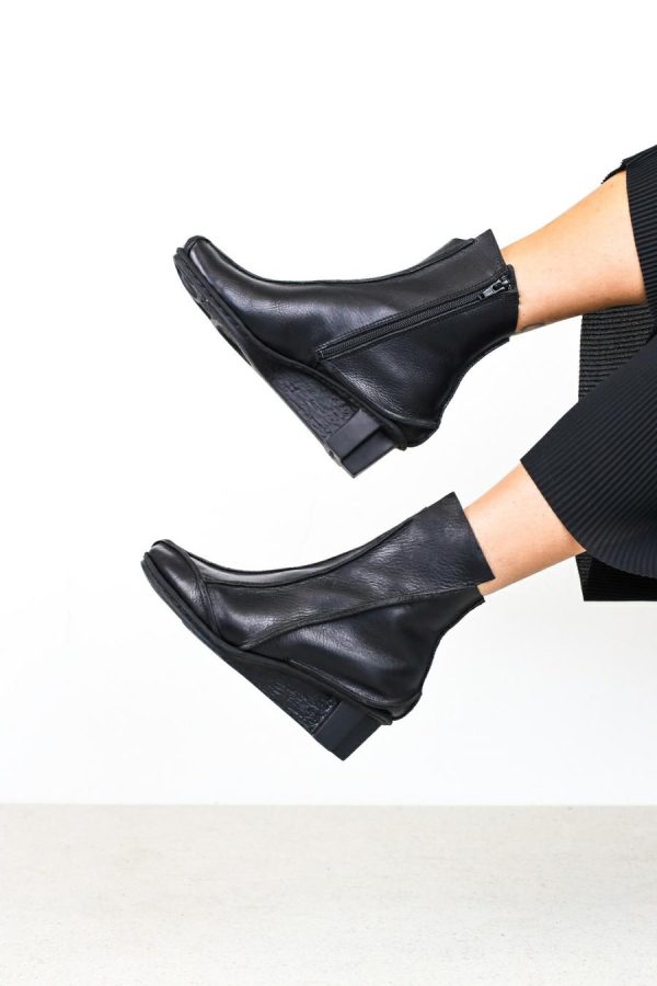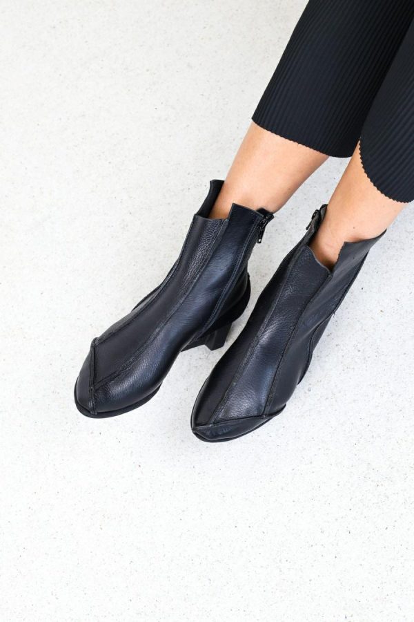 Striking ankle boot with slightly pointy toe shape and inner zip fastener. Complemented by a number of raw seams, the combination of narrow sections lends the model a pleasingly slender shape.